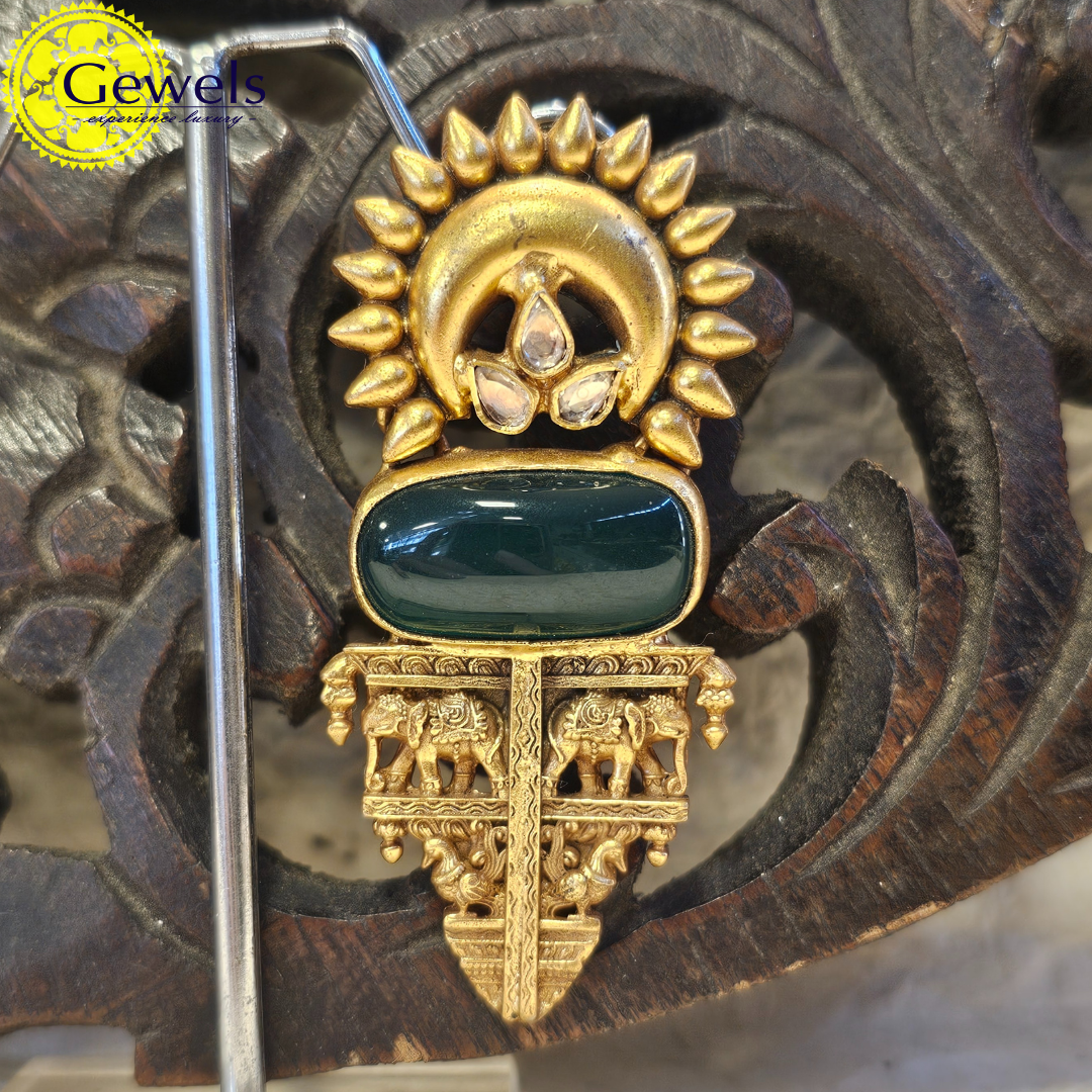 A mesmerizing blend of heritage and nature, these earrings feature intricate elephant motifs and deep green stones, exuding timeless elegance.