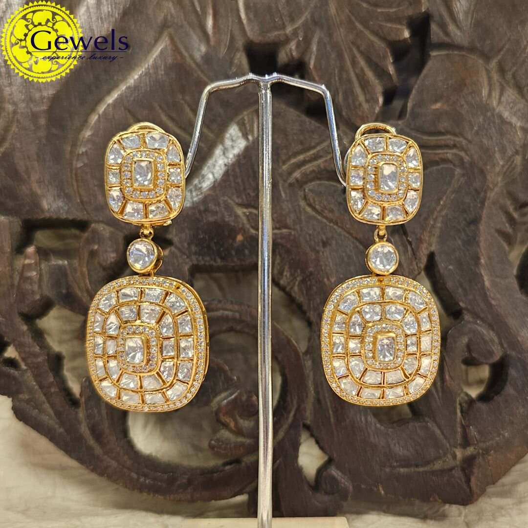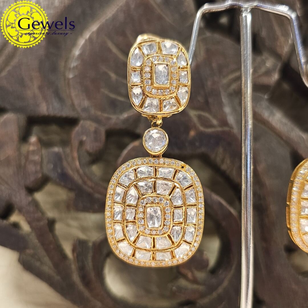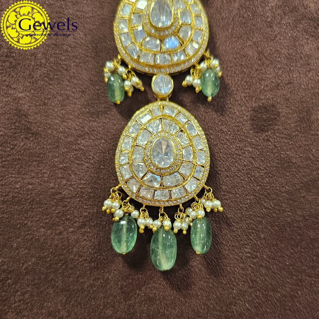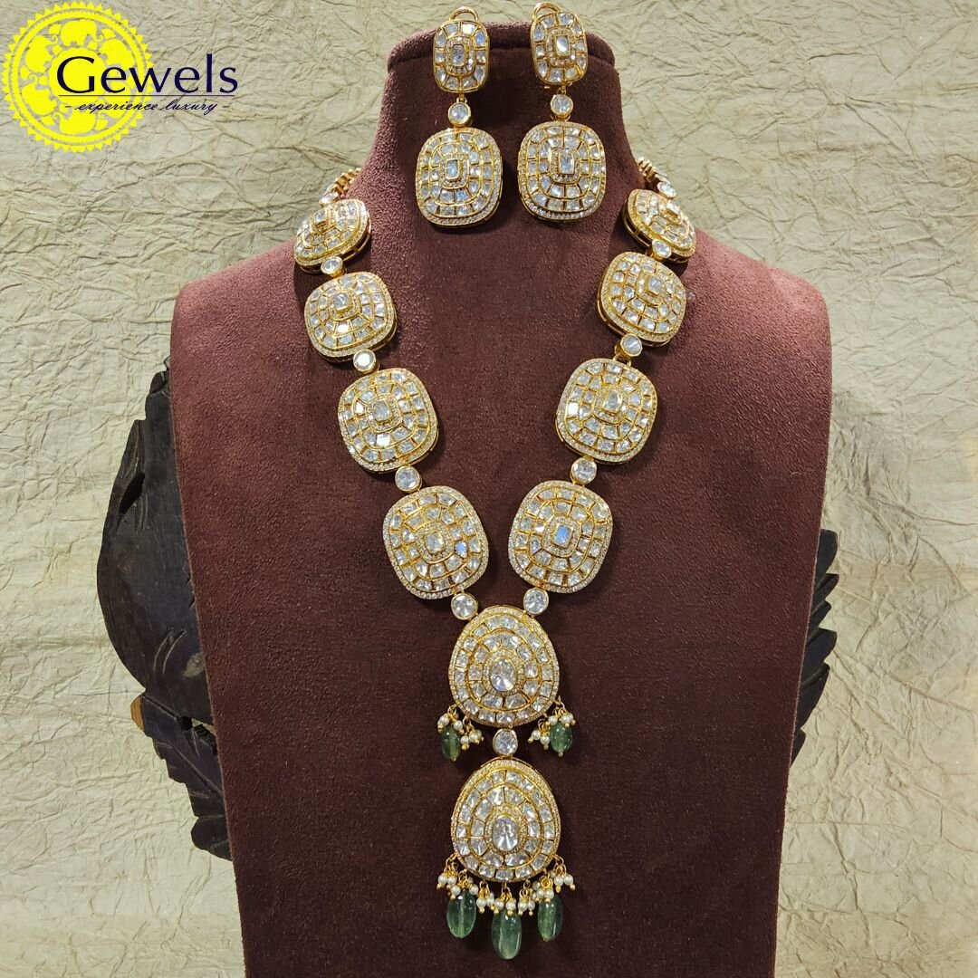 The Gewels Aurora Twilight Polki Necklace. This captivating piece features intricate patterns of polki diamonds that evoke the beauty of twilight. Crafted with a blend of traditional craftsmanship and modern design, it exudes opulence and refinement, making it perfect for any special occasion.