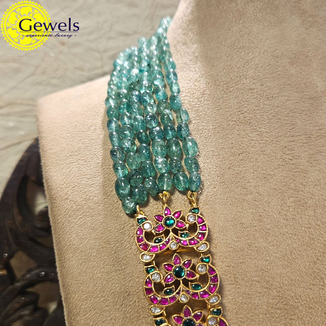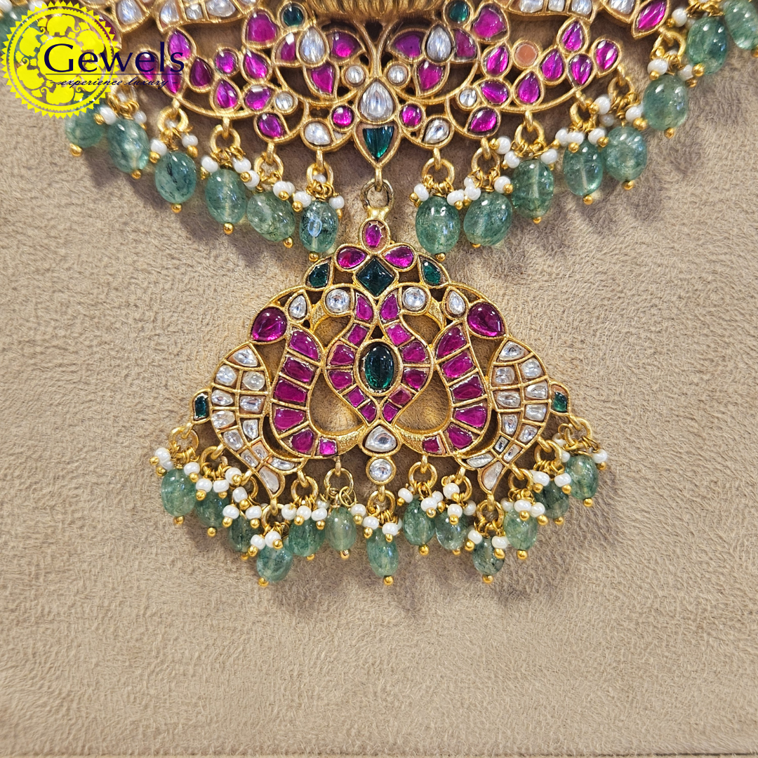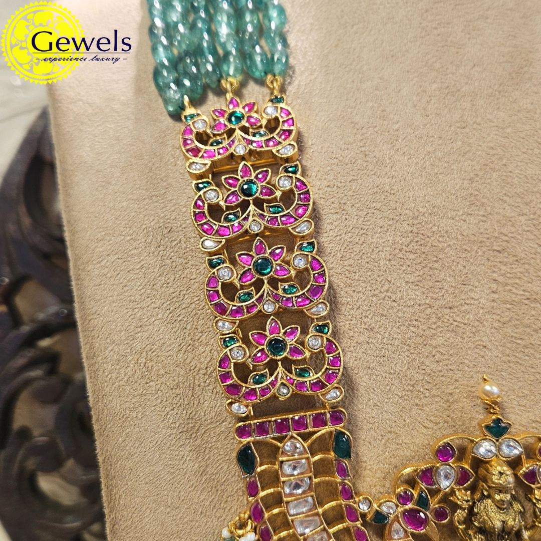 Gewels Lakshmi Vighnaharini Haram is a stunning Indian necklace adorned with emeralds and rubies, featuring a central pendant depicting Goddess Lakshmi, believed to bring wealth, prosperity, and protection against obstacles.