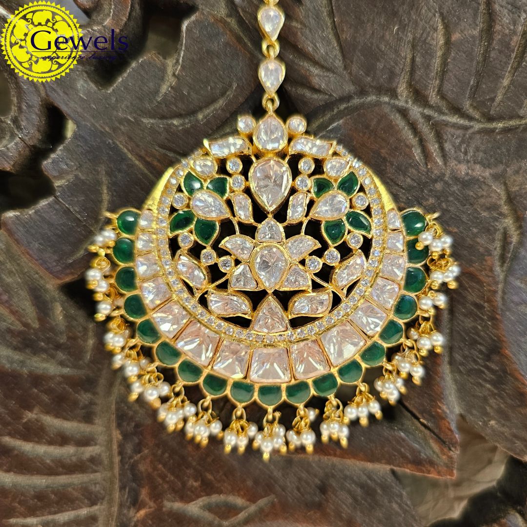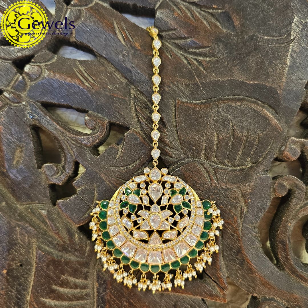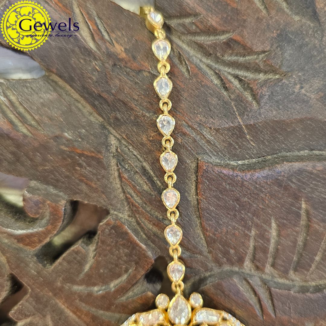The Gewels Maharani Maang Tika is a regal headpiece that exudes grace and grandeur. Inspired by the elegance of Indian royalty, this Maang Tikais intricately adorned with stunning Polki diamonds, accentuated by intricate detailing and exquisite craftsmanship. With its majestic design and luxurious appeal, the Gewels Maharani Mathapatti adds a touch of sophistication to any bridal ensemble or formal occasion, making it the epitome of timeless beauty and opulence.