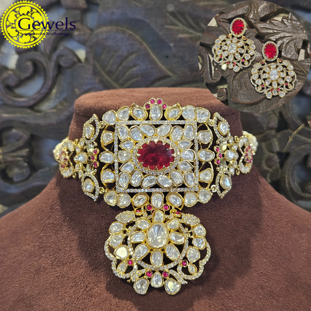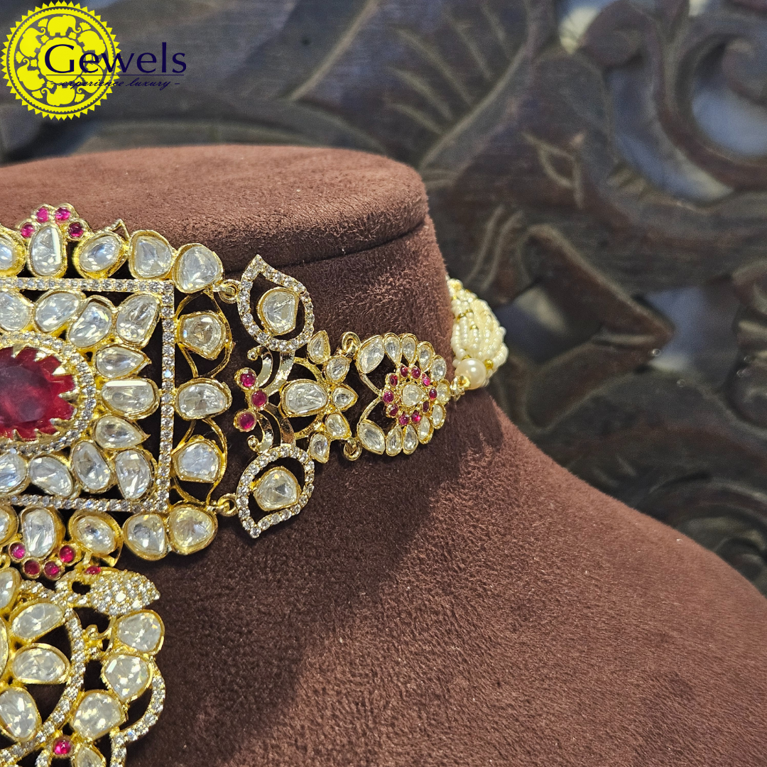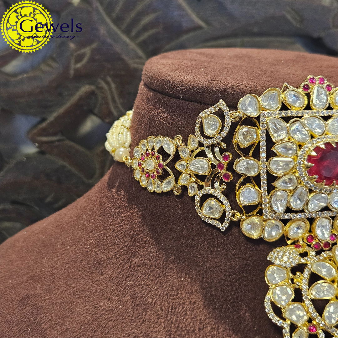 A captivating necklace set adorned with precious gems, inspired by the Hindu goddess Rukmini, known for her beauty and grace.