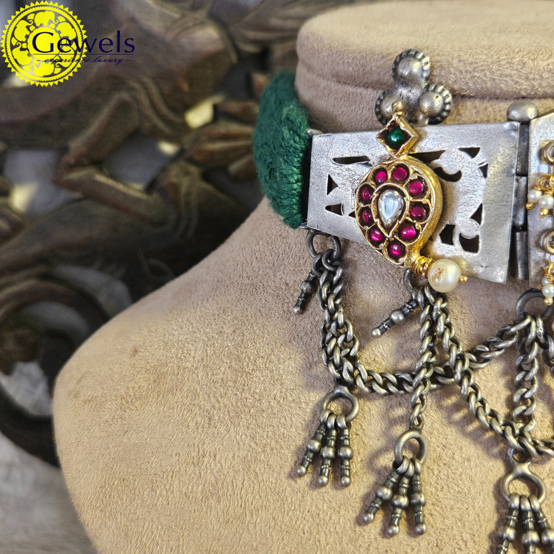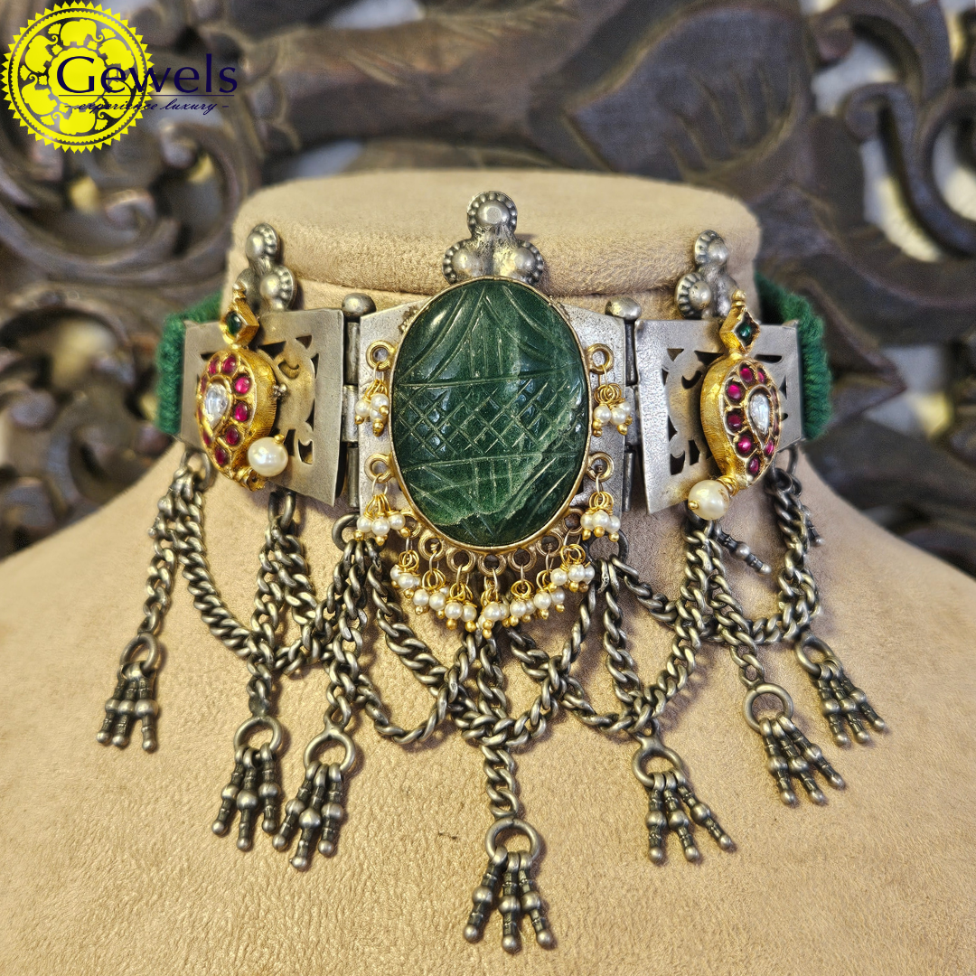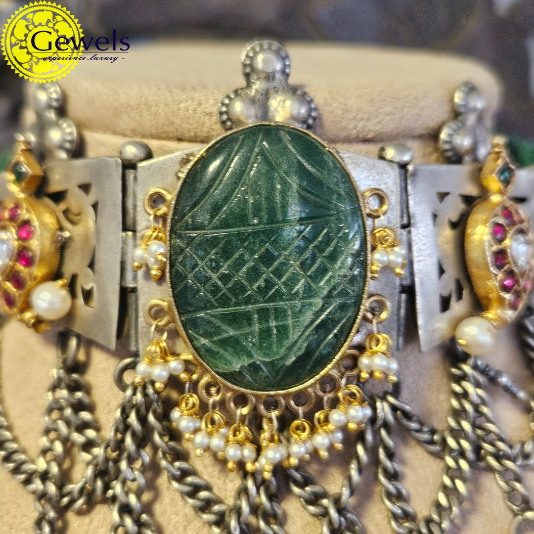 A regal fusion of emerald elegance and intricate metalwork, this choker drapes you in royal splendor with every delicate detail.
