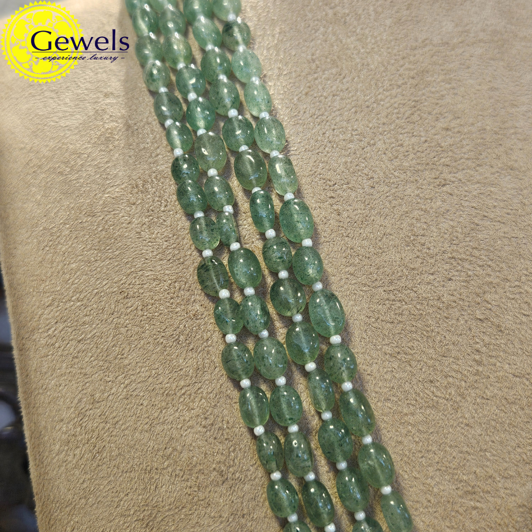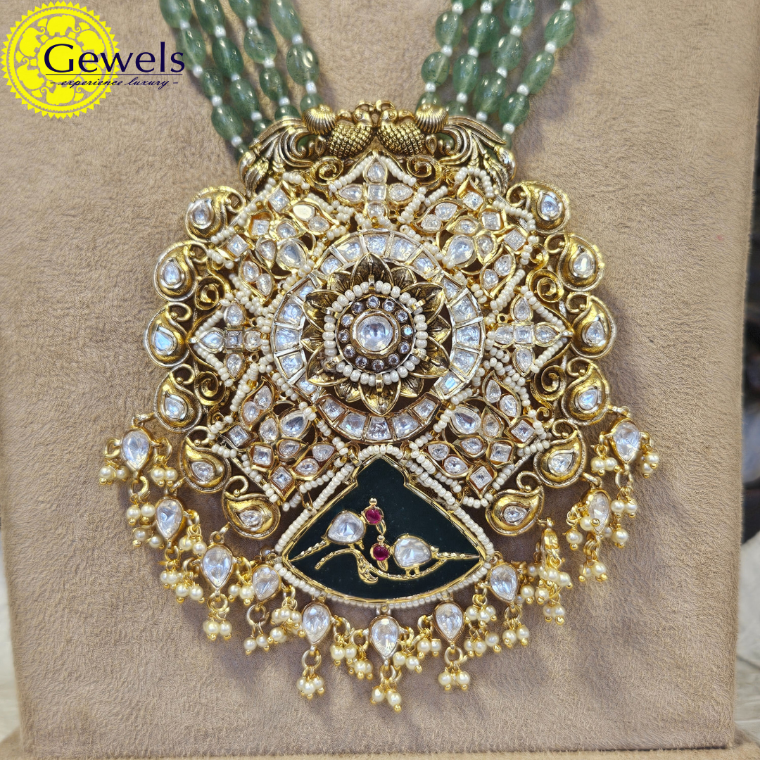 An exquisite multi-layered emerald bead necklace with a mesmerizing gold and polki pendant, embodying pure elegance and timeless charm.